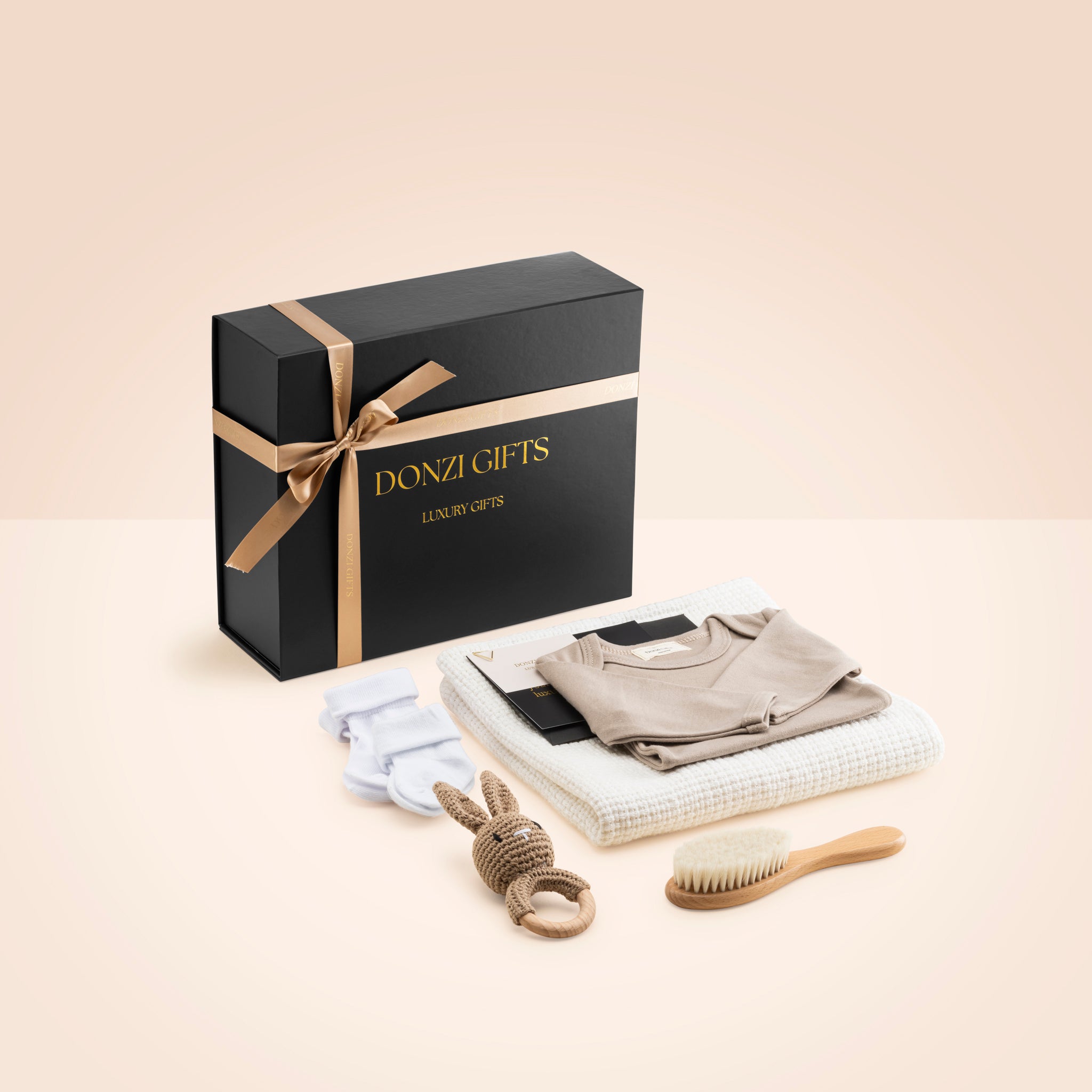 De Baby Box is een zorgvuldig samengestelde geschenkdoos voor pasgeborenen, gevuld met comfortabele en praktische babyspullen.